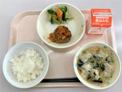 ごはん、煮込み風ハンバーグ、添え野菜、ワンタンスープ、牛乳