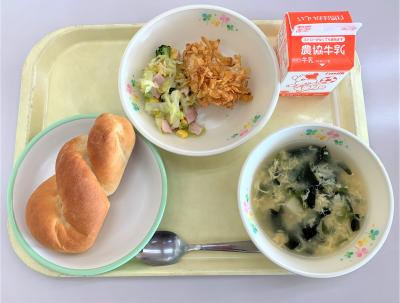 米粉パン、クリスピーチキン、コーンサラダ、卵スープ、牛乳