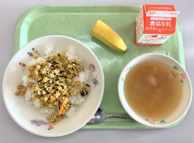 そぼろ丼、せん切りスープ、バナナ、牛乳