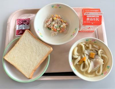 米粉パン、チキンナゲット、キャベツソテー、五目うどん、牛乳