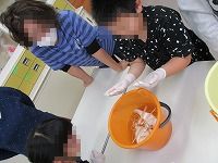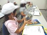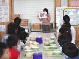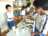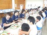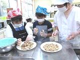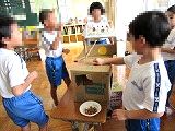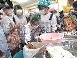 沖波きび加工組合の山口さん・目年さんにおいでいただき、3年生がきびだんご作りを体験しました。まず最初に、きびの粉ができるまでに色々な作業を加え、1年かかることを教えていただきました。次に、粉をこねてだんごを作り、きな粉をかけてたんさんのきびだんごができあがりました。給食時間に全校にも分け、みんなで美味しくいただきました。