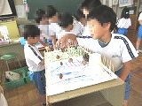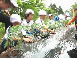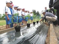 地元でトマトを栽培している勝井さんから、1・2年生がトマトの植え方を教えていただきました。勝井さんからトマトは音楽を聞くと大きく育つことを学び、水やりをした後、子どもたちは大きな声で校歌を歌いトマトの成長を願っていました。