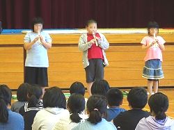 ふれあい集会で3・4年生がステキな発表をしました。4月から練習を始めたリコーダーの美しい音色を3年生が披露したり、3・4年生の明るい声で「歌のにじ」を体育館に響かせたりしました。また、地図記号や都道府県の特徴をもとにした社会科クイズで全校を楽しませました。