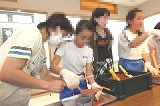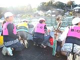 秋晴れの下、3年生が船に乗せていただき中居湾に浮かぶのカキ棚を見学しました。講師の松村さん・小泉さんからは、稚貝の育て方や養殖の工夫などについて教えていただきました。また、穴水町のシンボルであるボラ待ちやぐらを船上から眺め、その高さや大きさにも驚きました。