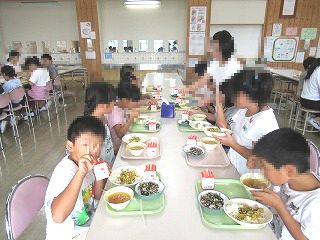 おもてなしのための、ご馳走は、山や田でとれた、さといも、きのこ、たいこん、にんじん、豆などと使って料理します。魚は本来尾頭付きを使いますが、給食では、地元のふくらぎを使いました。