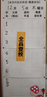 | 平年よりも流行が早い今年のインフルエンザ・・・。すでに石川県は、インフルエンザ注意報が発令されています。向洋小学校でも、流行が心配されていますが、今日は全員が登校しました! 十分な睡眠をとったり手洗いを心がけたりして、予防に努めましょう。 | |