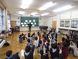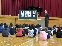 3限目、ランチルームで冬休みの生活について児童総会が開かれました。