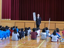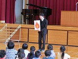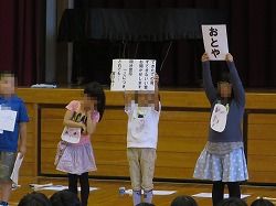 本年度最初の「ふれあい集会」を行いました。2・3年生の学習発表では、2年生が鍵盤ハーモニカでの「かえるの合唱」の演奏と「たんぽぽのちえ」クイズを行いました。3年生は「きつつきの商売」の音読と「きびに関する○×クイズ」を行いました。明るくハキハキした声、工夫を凝らした発表はステキでした。