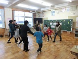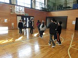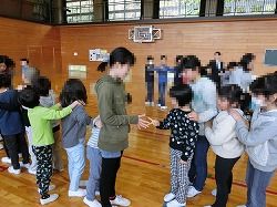 「まねっこゲーム」では、縦割り班に分かれてカードに描かれたサルやイナズマ、流れ星などをジェスチャーで表現しました。「ジャンケン列車」では、50人がひとつの長い列車になりました。