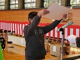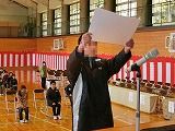 校長先生が桃太郎のお話から、犬は、賢く行動的。戌年の人は、勤勉で努力家。