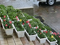 校務員さんが育ててくださったマーガレットとチューリップも玄関前で雨にぬれています。