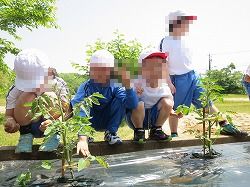 1・2年生が、地元でトマトを栽培している勝井寛さんからミニトマトの植え方を教えていただき上手に植えることができました。勝井さんからトマトは音楽を聞くと大きく育つことを学び子どもたちは大きな声で校歌を歌いトマトの成長を願っていました。