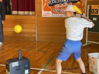 寄贈式には、西野さんからニュースポーツの「二水ボール」の機材紹介と実際のプレーにあたりルール説明をしていただきました。4年生から6年生の子ども達は2チームに分かれて、空中に浮くボールをホームラン級にかっ飛ばしました。