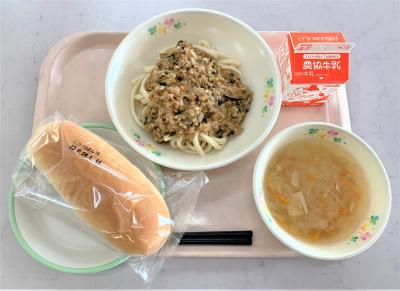 こっぺぱん、ジャージャーうどん、麹のスープ、牛乳