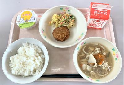 ごはん、メンチカツ、そうめんかぼちゃのサラダ、けんちん汁、お月見デザート、牛乳