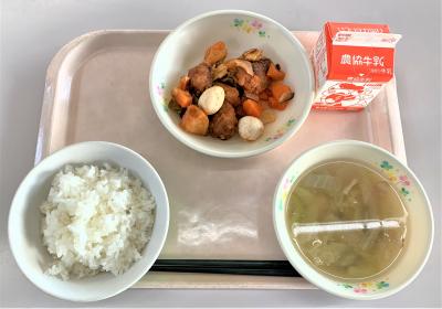 ごはん、いわしのみぞれ煮、切干大根の煮物、のっぺい汁、牛乳