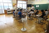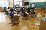大雨でプールに入れない日も、扇風機を回しながらお勉強を頑張っています。