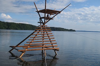 朝日の中のボラ待ちやぐら