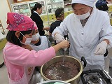 おもてなしのための、ご馳走は、山や田でとれた、さといも、きのこ、たいこん、にんじん、豆などと使って料理します。魚は本来尾頭付きを使いますが、給食では、地元のふくらぎを使いました。