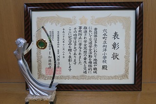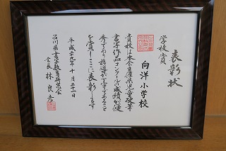 学校全体で今回の硬筆作品が優秀であるということで県書写教育研究会から学校賞をいただきました。文字は、書写の時間だけで上達するものではありません。日頃の勉強時間や家庭学習などで丁寧な文字を書こうと心がけることが大切です。