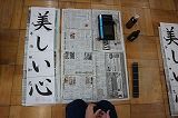 特に、3年生は、授業での毛筆がはじめです。机を廊下へ出して、床に道具を並べます。