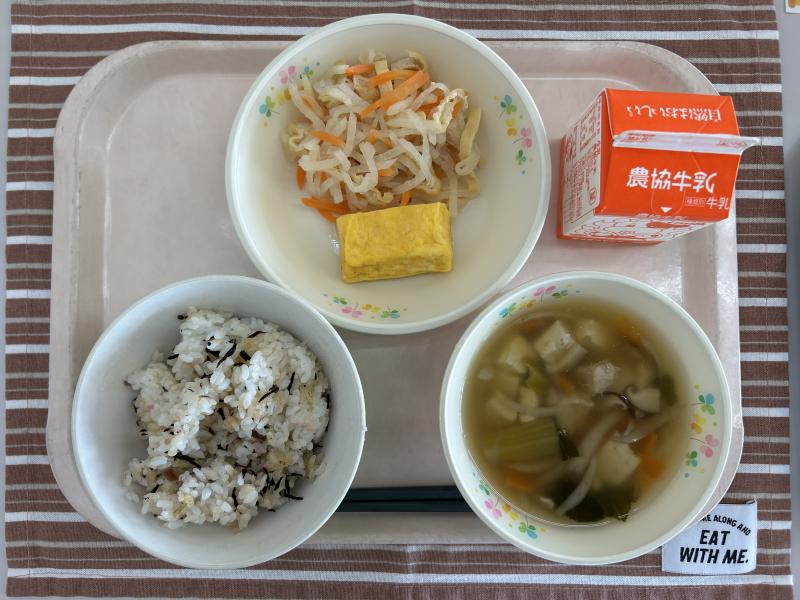 今日の副菜は「くきわかめのあえもの」です。こりこりした食感が特徴のくきわかめと野菜を白みそやコチュジャンなどで作った調味料で和えました。さっぱりした味で食べやすかったのですが、子どもたちはくきわかめが苦手な子が多かったです