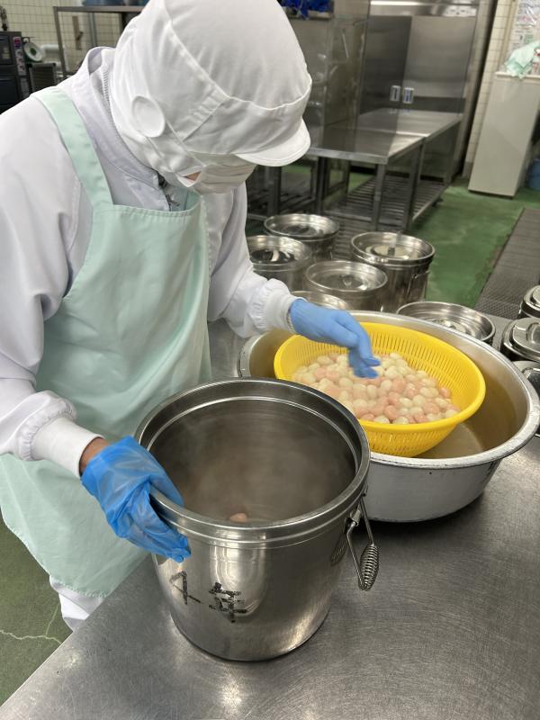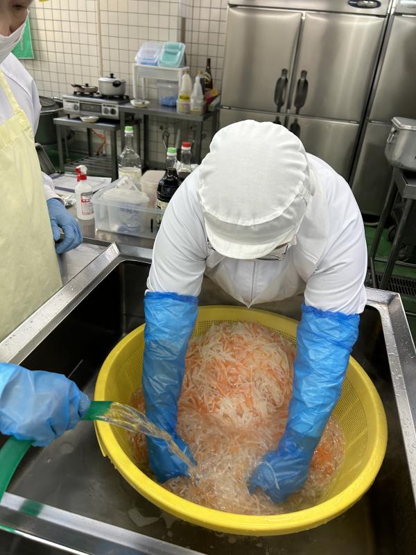給食では、紅白のおもちを入れました。みんなに数があたるよう調理員さんは数を数えてくれました。また副菜は、「紅白なます」です。シャキシャキをした食感に仕上がりました。