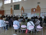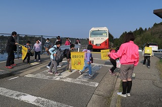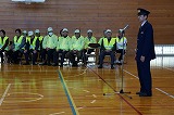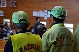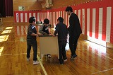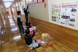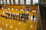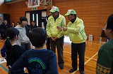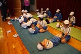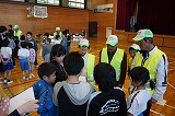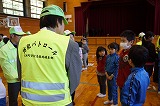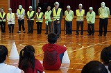 この後、本校独自で地震発生に伴い原子力災害が発生した想定で、防災頭巾を被って体育館へ一次避難をして、その後家族への引き渡しを想定して地区ごとに整列する練習を行いました。
