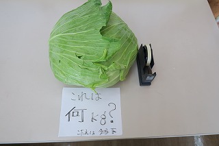 ランチルームに大型キャベツが展示されました。直径30cmほどです。