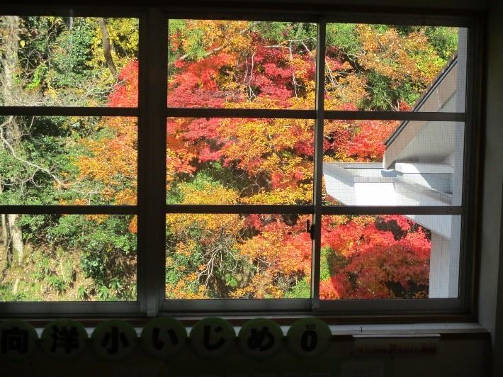 本校正面から、徐々に色づく中居湾の素晴らしい眺めを見ることができますが、山側にも季節(期間?)限定の絶景スポットがあります。それは、東階段の窓から見える紅葉です。窓の格子に切り取られたその様子はまるで絵画のようです。