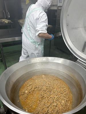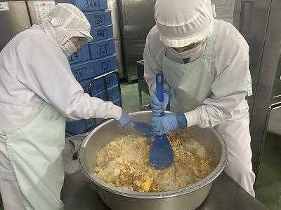 今日の給食は、中華料理です。キムチチャーハンは、中華スープ混ぜて炊いたごはんに、別の釜で作った具を混ぜ込みます。キムチのピリッとした辛さもありつつ、卵でマイルド仕上がりました。