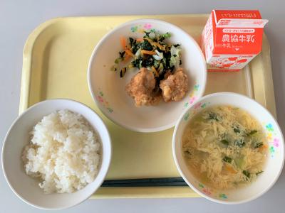 ごはん、ユーリンチー、磯辺和え、卵スープ、牛乳