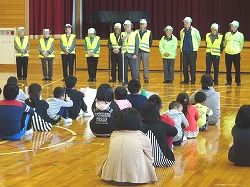 子どもたちの登下校を見守って下さる「子ども見守り隊」の方々との対面式を行いました。まずは、警察署長さんから交通安全や防犯についてのお話しがあり、その後、見守り隊の方々の紹介がありました。最後に地区毎に集まって自己紹介等をしました。見守り隊の皆さん、今年度もよろしくお願いいたします。