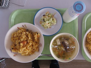 牛肉チャーハン 中華スープ いかくんサラダ 牛乳