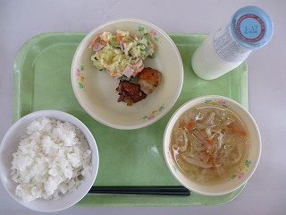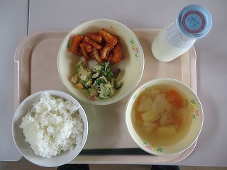 ごはん 大豆ナゲット いそあえ とり野菜 牛乳