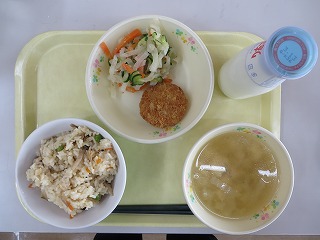 わかめご飯 メンチカツ サラダ みそ汁 ゼリー 牛乳