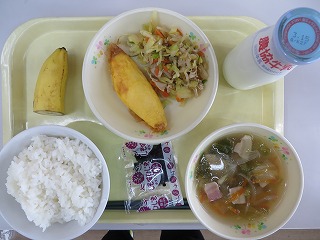 ごはん ビーンズオムレツ 野菜ソテー コンソメスープ バナナ 佃煮 牛乳