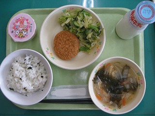 わかめご飯 ちくわの磯辺揚げ 野菜炒め 具だくさんみそ汁 牛乳