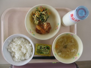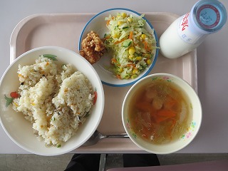 ミックスピラフ コンソメスープ 唐揚げ サラダ 牛乳