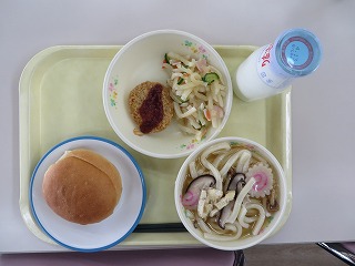 ミルクロール 親子うどん えびカツ おひたし 牛乳