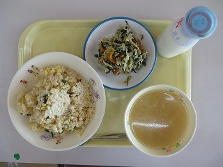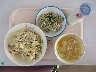 シーチキンチャーハン コンソメスープ ごぼうサラダ 牛乳