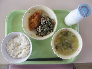 ごはん カレイ揚げ 千草あえ みそ汁 牛乳