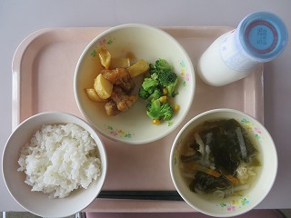 ごはん 鶏肉とじゃがいもの揚げ煮 そえ野菜 みそ汁 牛乳