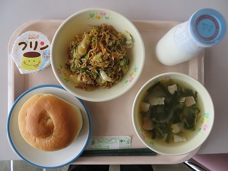ミルクパン 焼きそば 野菜スープ 豆乳プリン 牛乳