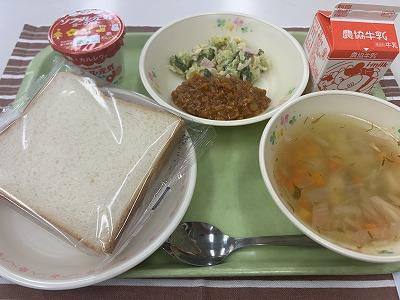 今日の給食は、「メキシコ料理」です。タコスをイメージしたタコミートは、食パンにはさんで食べます。メキシコでは、とうもろこしの粉で作ったトルティーヤに挟はさんで食べるそうです。