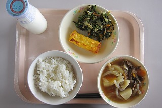 ごはん 肉じゃが だし巻き卵 いそあえ 牛乳