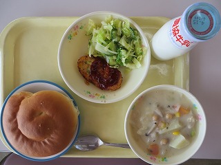 ミルクロール クリームシチュー 彩り野菜バーグ サラダ 牛乳