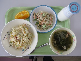 焼き豚チャーハン 中華スープ 春雨ごぼうサラダ オレンジ 牛乳