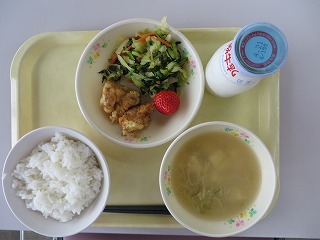 ごはん チキン南蛮 おひたし いちご みそ汁 牛乳