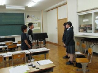 穴水高校の先輩2名と弁論部顧問の先生においでいただき、6年生に弁論指導をしていただきました。高校生は、全国高校総合文化祭入賞者と本校卒業生であり、「嬉しさを伝えるには嬉しい表情で」「日頃から、口をはっきりあけての発声練習も意識して」等のアドバイスをしていただきました。本日の指導を受けて、「穴水町少年の主張大会」に2名の6年生が参加します。
